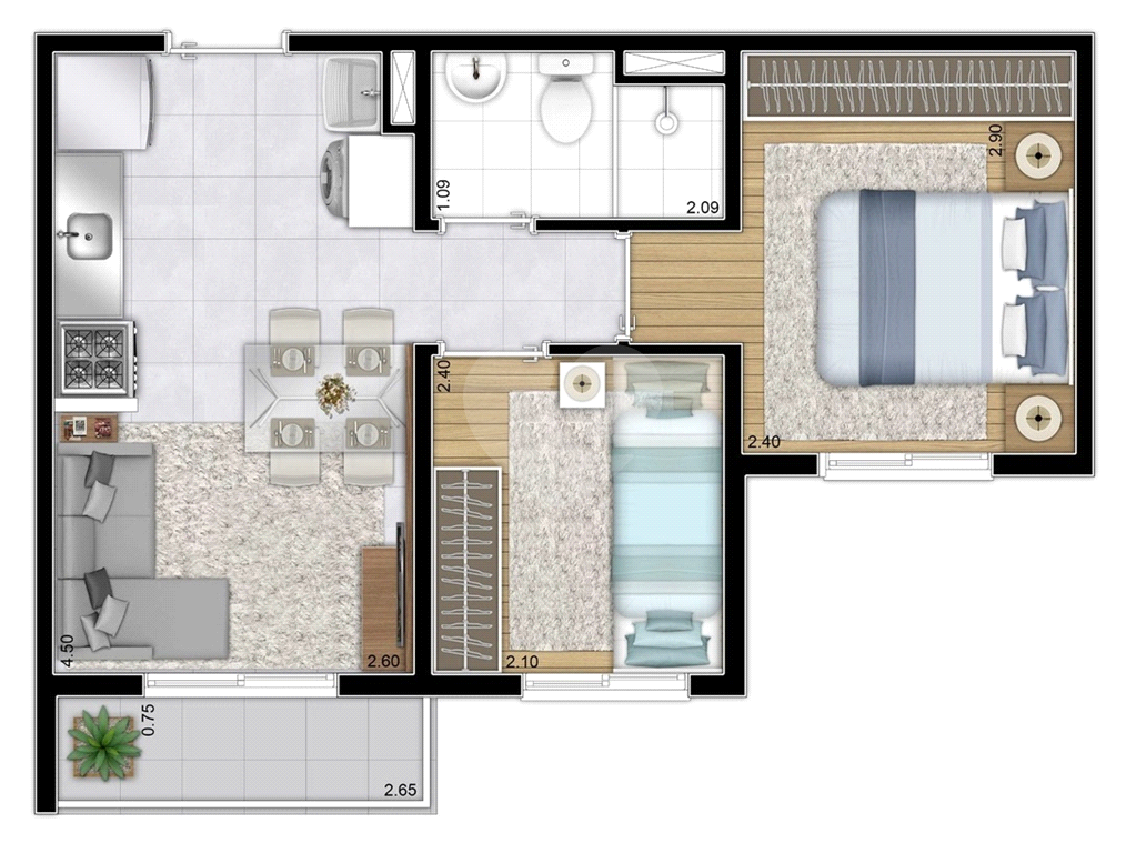 São 37 metros bem distribuídos, com sala para dois ambientes, cozinha, área de serviço e 1 banheiro.