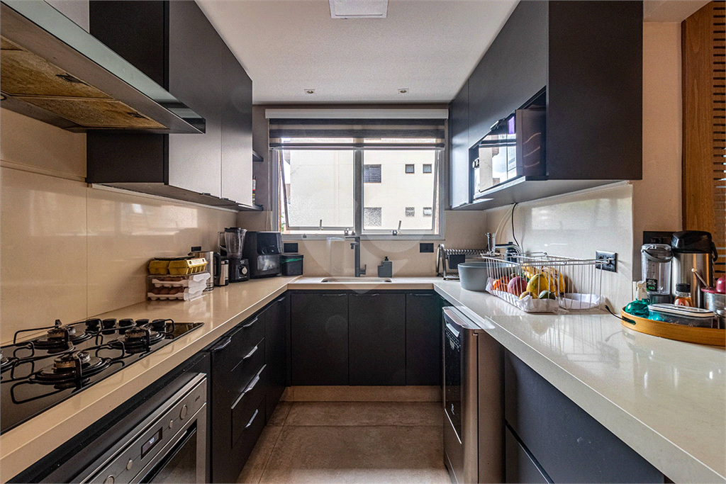 O lavabo segue o mesmo padrão sofisticado, com acabamento em mármore. A cozinha é inteiramente equipada com Quartzo Italiano, aliando funcionalidade e design, além de marcenaria sob medida em todos os ambientes. A área de serviço é completa, com banheiro para funcionária.