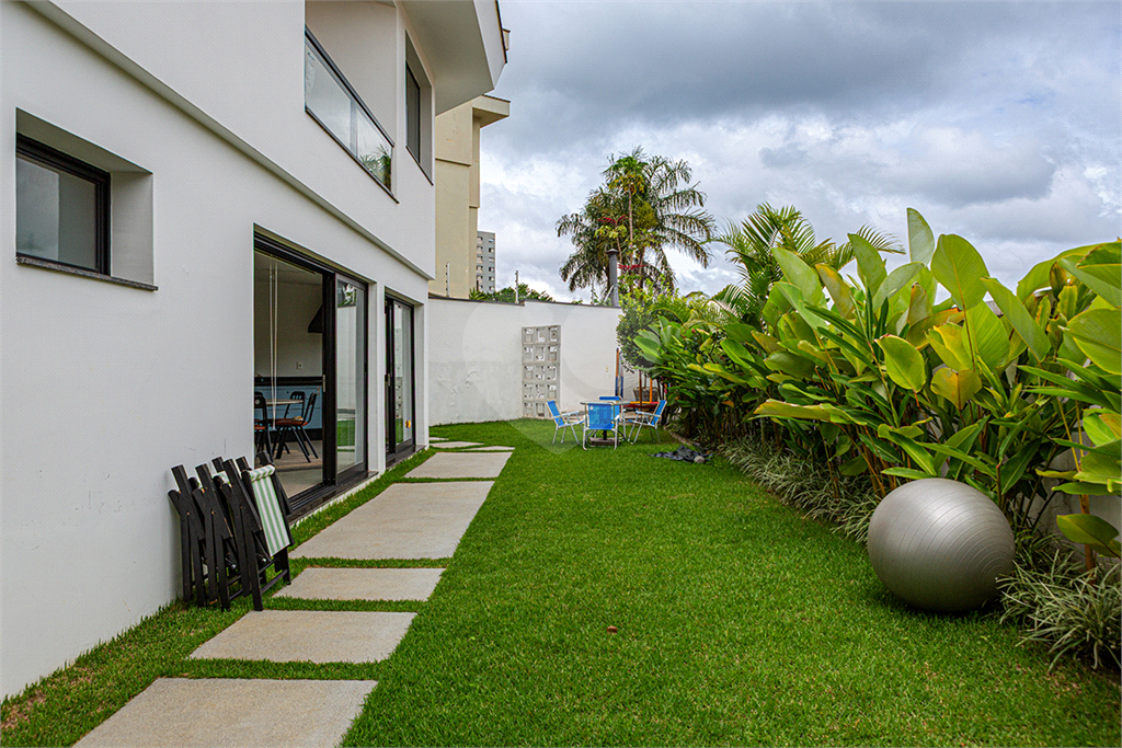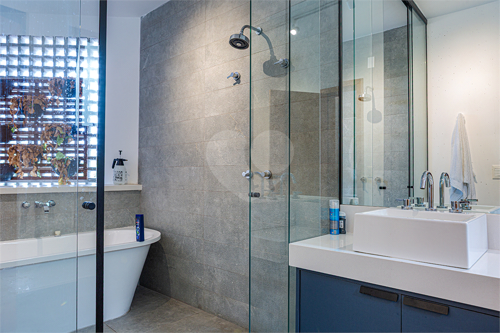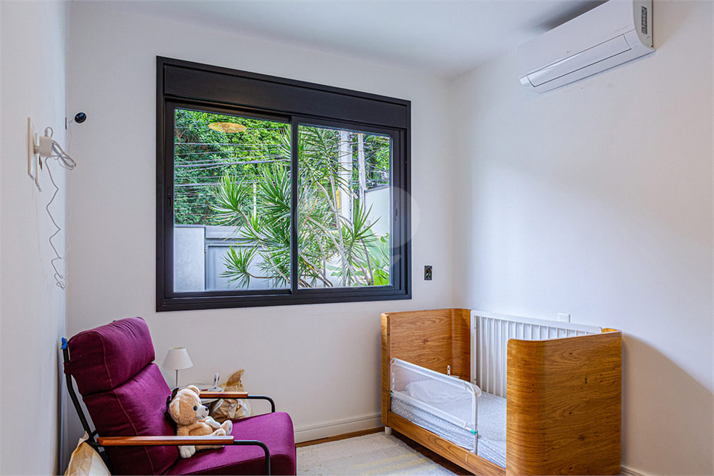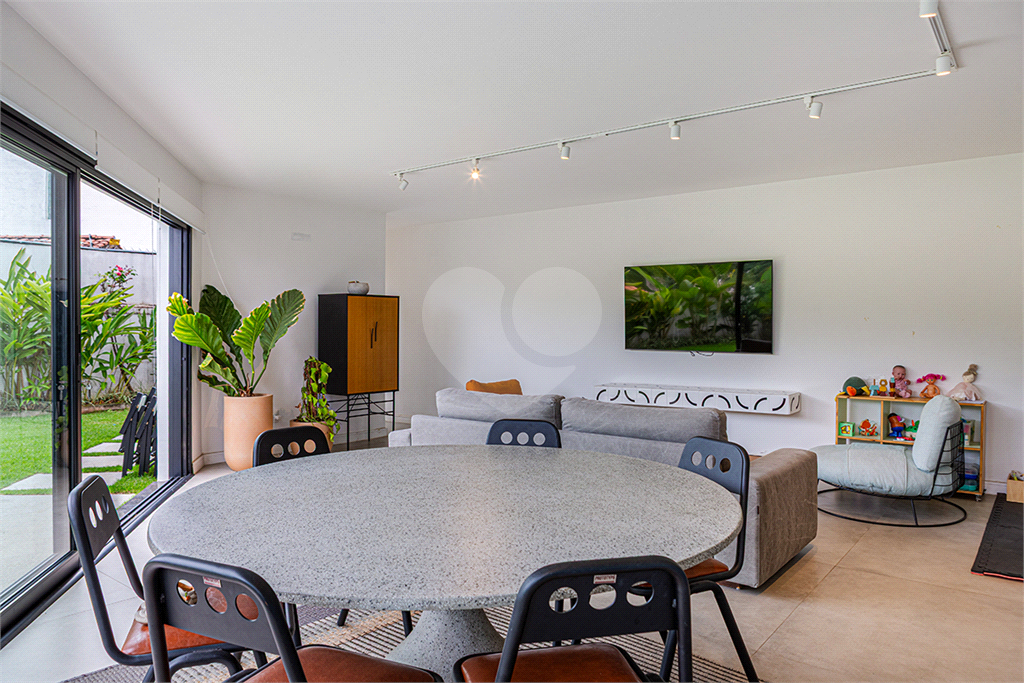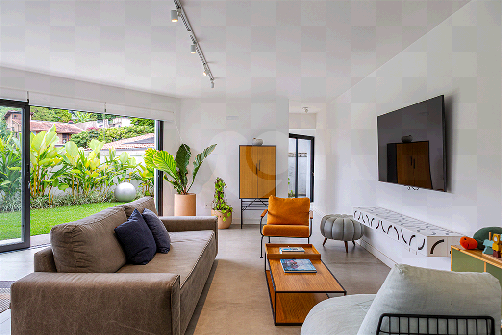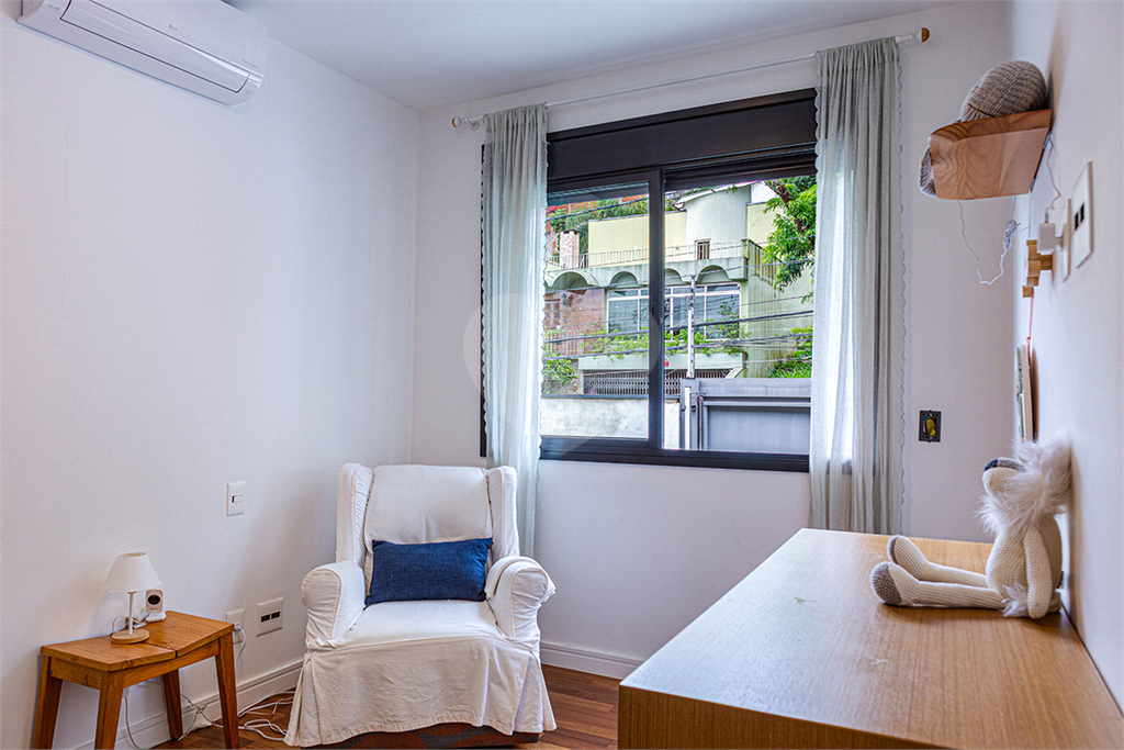 No pavimento principal em nível da rua, os ambientes sociais contam sala de estar, sala de jantar, lavabo, varanda integrada e cozinha com despensa, todos climatizados. Na área íntima conta com três suítes, sendo a suíte principal com closet, com muito conforto e privacidade. No pavimento inferior com acesso ao jardim com muito verde, tem um amplo salão coberto que possui área Gourmet, sala de estar, escritório, academia e lavabo, criando inúmeras possibilidades de uso. Garagem com quatro vagas, área de serviços e dependências de funcionários completa.