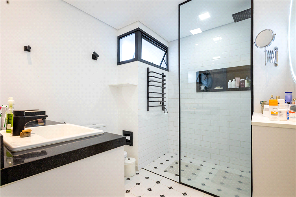 Para maior segurança, o imóvel conta com um sistema de alarme instalado em todas as portas externas, janelas e portas de vidro. Também há um monitoramento por câmeras nas entradas, rua e garagem.