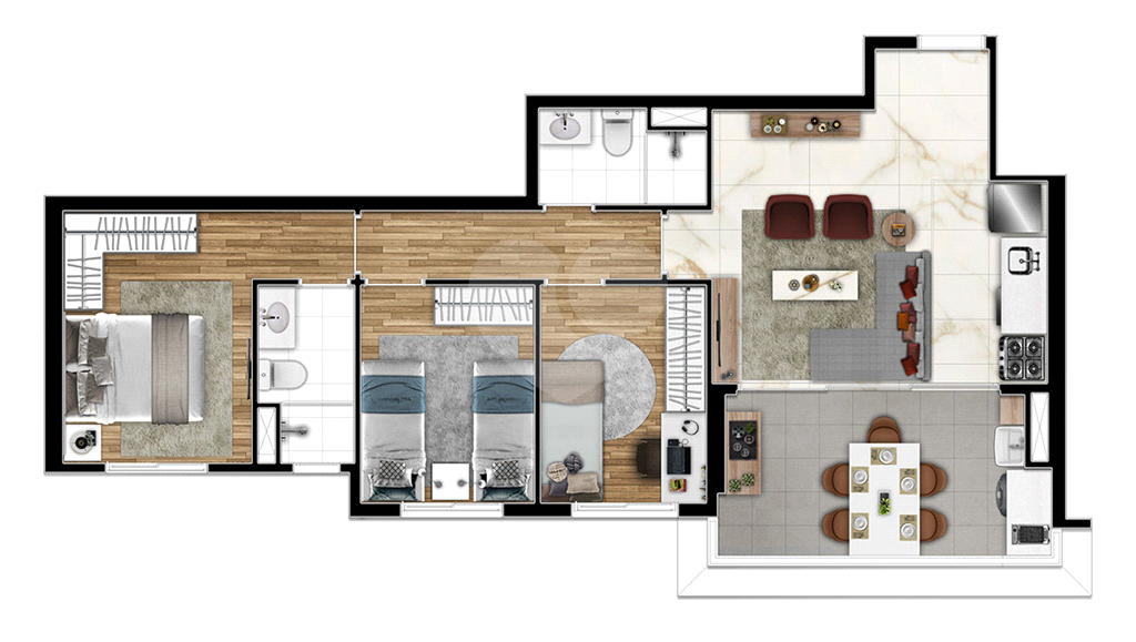 Os apartamentos foram cuidadosamente projetados com foco na funcionalidade, conforto e otimização dos espaços.