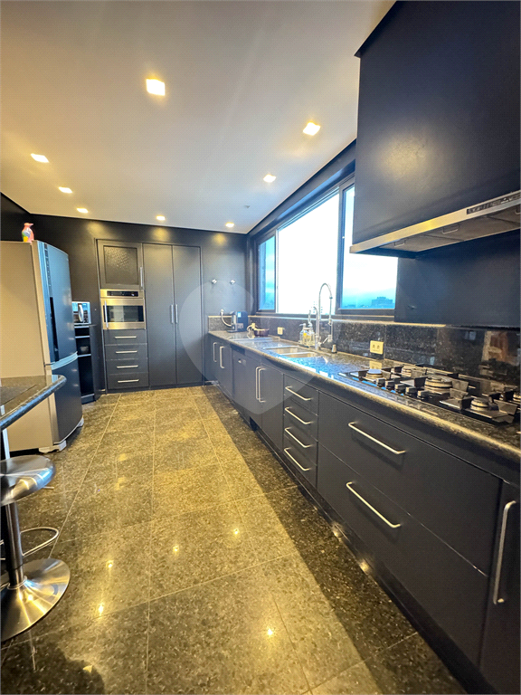 A cozinha é espaçosa, funcional e também privilegiada pela vista, conectando-se à área de convivência e varanda, criando um ambiente único para o dia a dia ou para receber convidados com conforto. A área de serviço segue o mesmo padrão de acabamento, com marcenaria bem executada e banheiro de apoio.