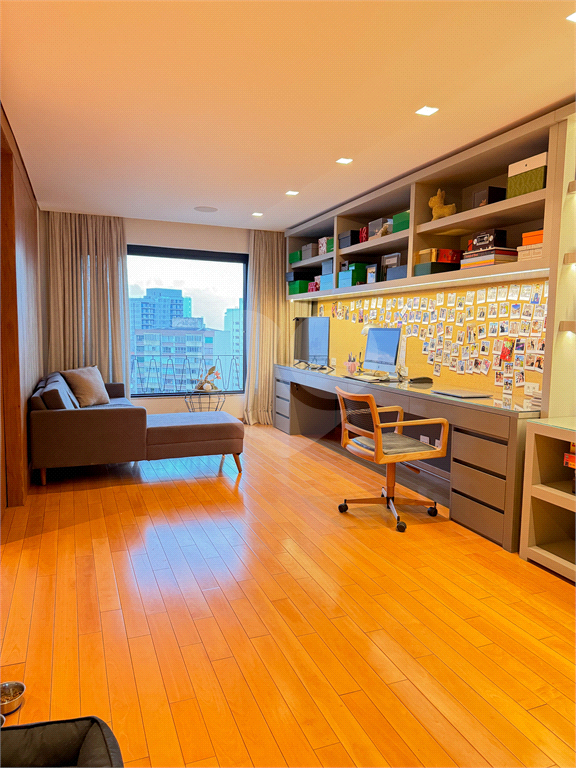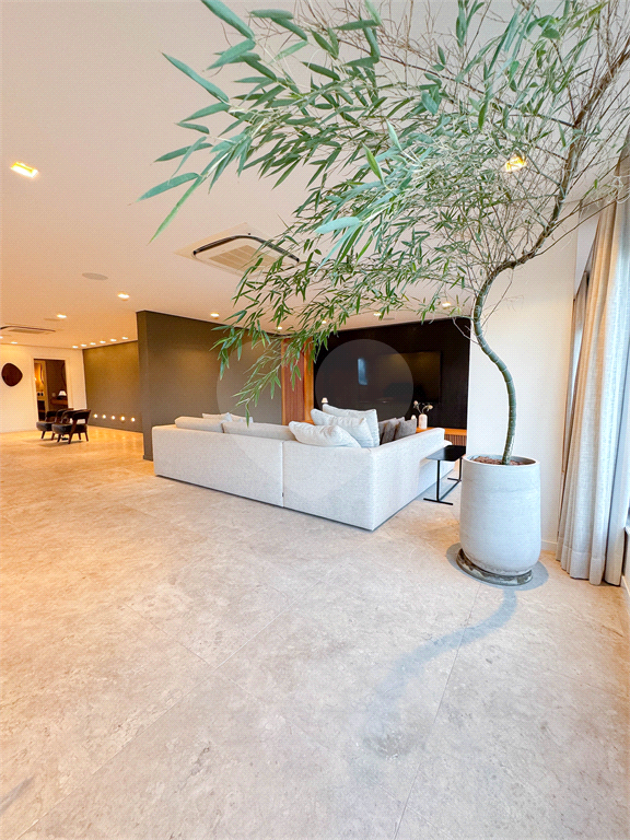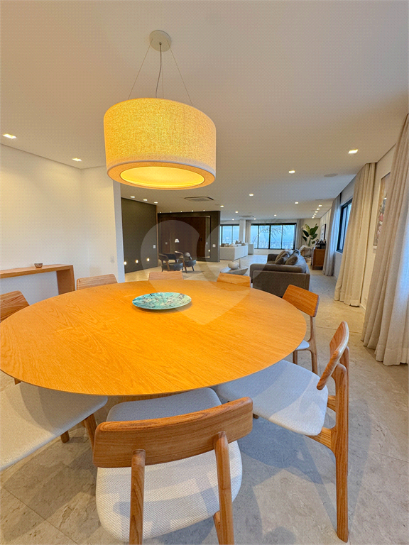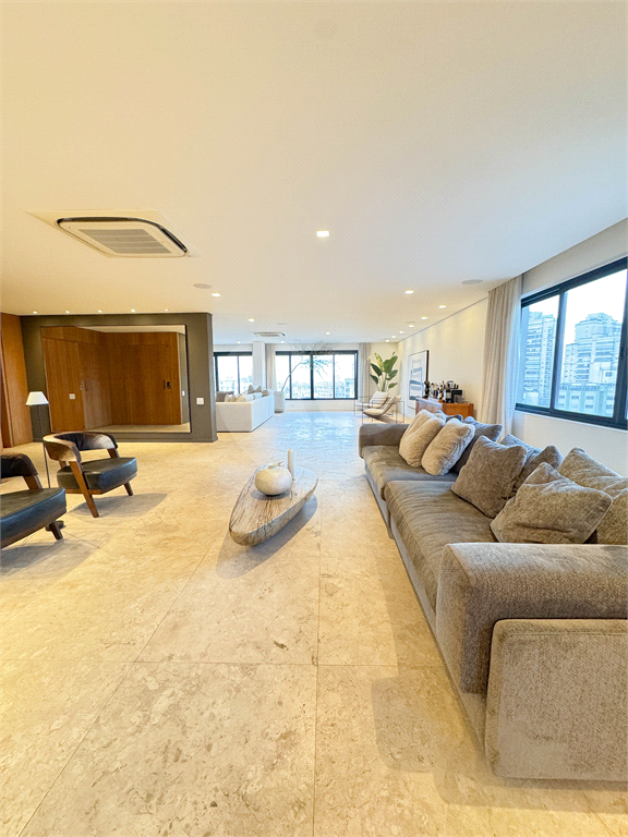 O living é um dos grandes destaques, com integração total entre salas de estar e jantar, proporcionando uma área social imponente, perfeita para receber. As amplas janelas revelam uma vista panorâmica da cidade, com destaque para o skyline de São Paulo, incluindo ícones como o Altino Arantes e a região da Paulista.