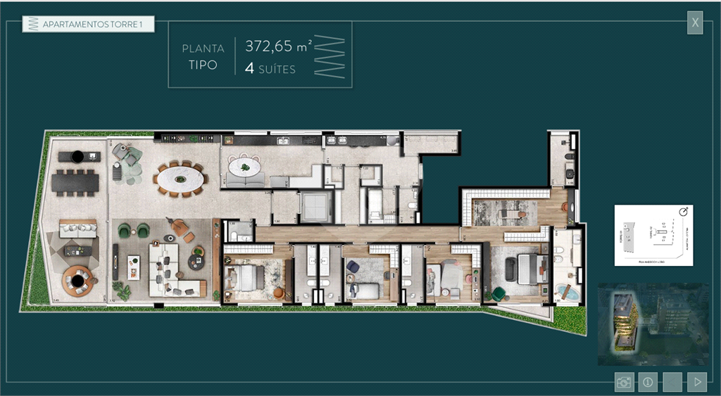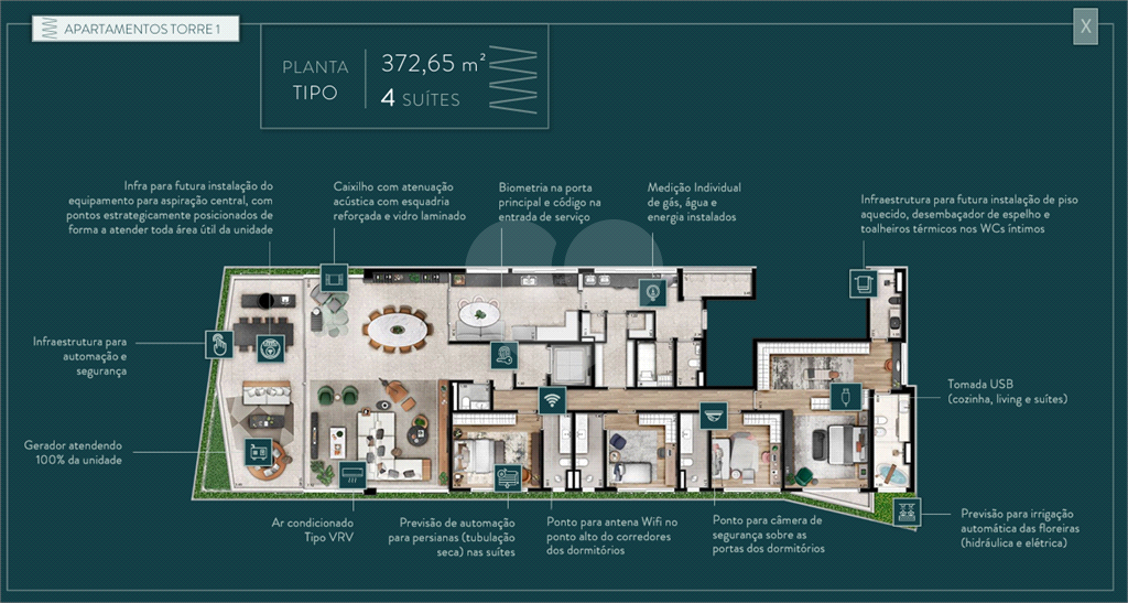 Em um terreno de 2879m² divididos em 2 torres, o empreendimento exclusivamente residencial, contará com apartamentos espaçosos de 372,65m², com 4 dormitórios, 4 suítes, possuindo de 4 vagas na garagem.