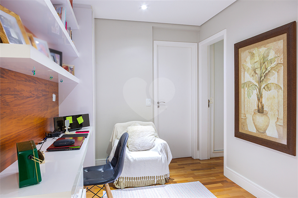 O hall que dá acesso às suítes foi planejado como um aconchegante escritório.