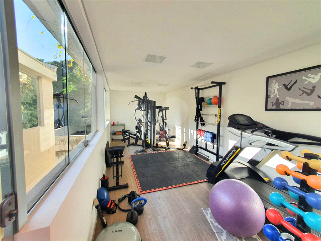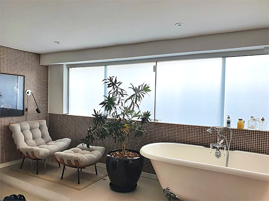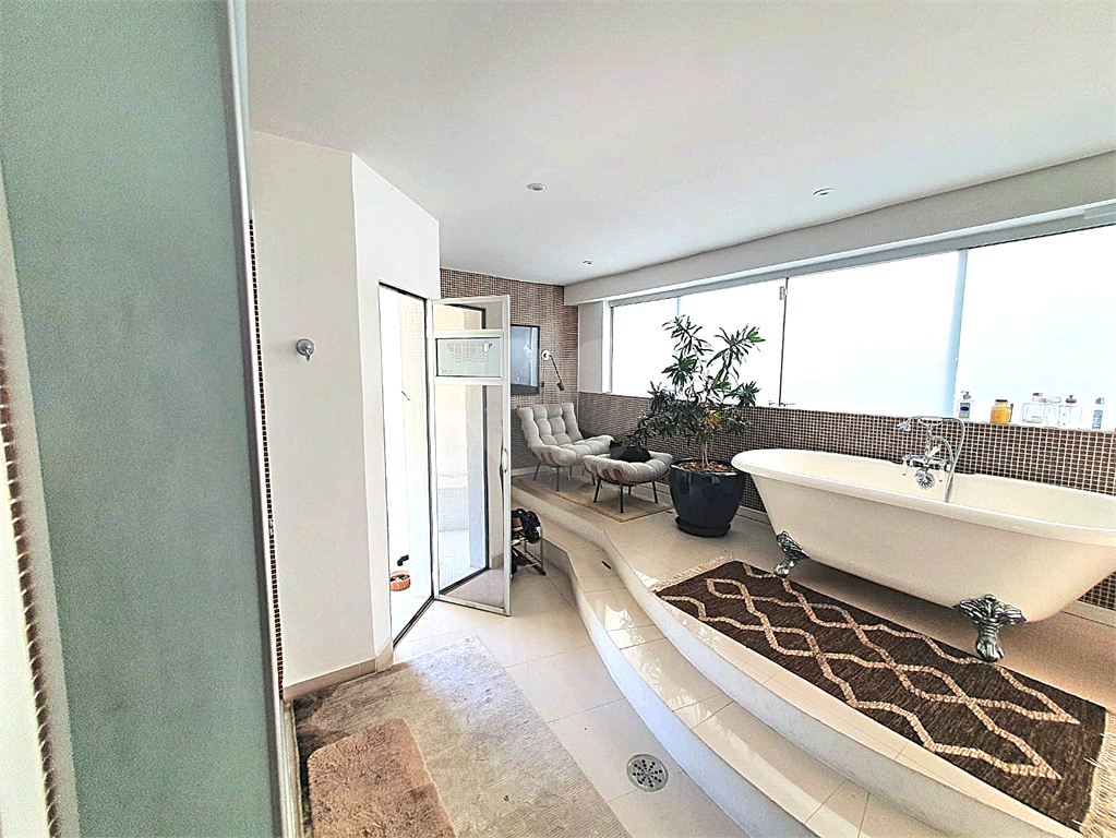 Piso Superior: 1 suíte master com banheira, sauna e pia com duas cubas, acesso direto a um anexo que servia como academia, sala de TV ou jogos, sala de apoio ao terraço com churrasqueira e espaço gourmet.