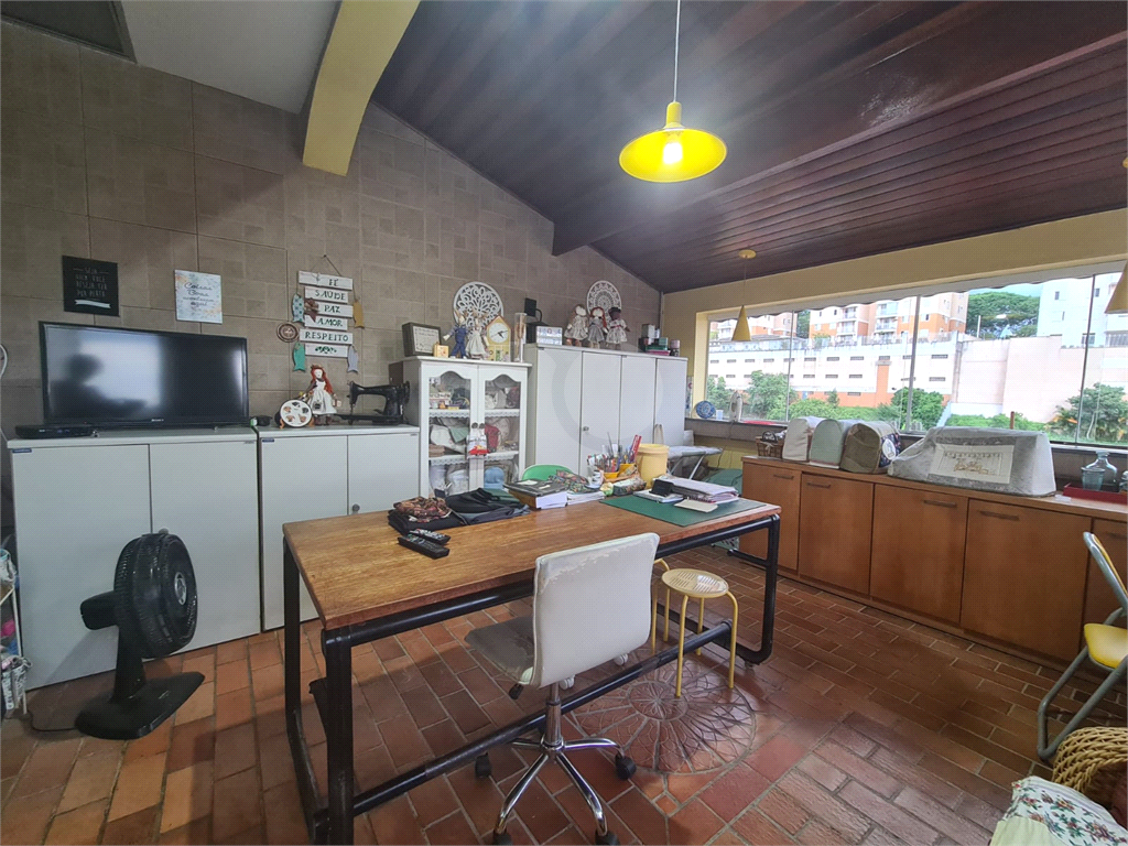 Em outro pavimento, o sobrado revela um espaço extremamente acolhedor: uma sala de lareira aconchegante, perfeita para os dias mais frios, integrada a um ateliê todo envidraçado, com excelente iluminação natural — um ambiente inspirador, versátil e cheio de personalidade.