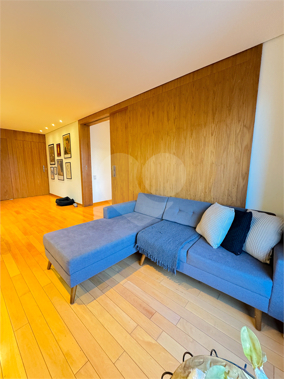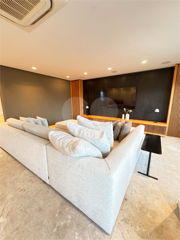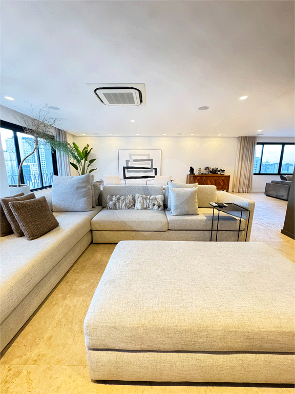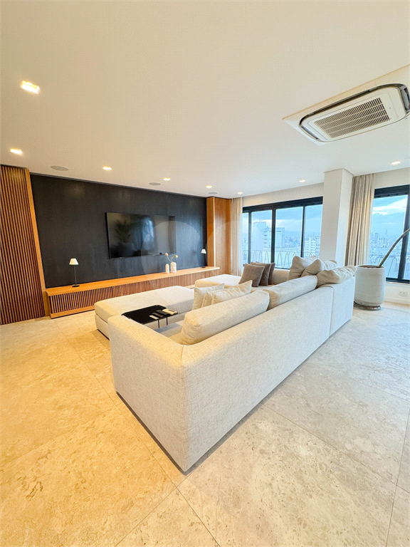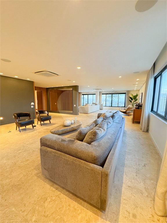 O living é um dos grandes destaques, com integração total entre salas de estar e jantar, proporcionando uma área social imponente, perfeita para receber. As amplas janelas revelam uma vista panorâmica da cidade, com destaque para o skyline de São Paulo, incluindo ícones como o Altino Arantes e a região da Paulista.