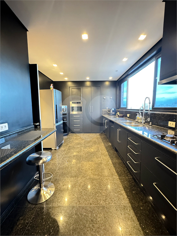 A cozinha é espaçosa, funcional e também privilegiada pela vista, conectando-se à área de convivência e varanda, criando um ambiente único para o dia a dia ou para receber convidados com conforto. A área de serviço segue o mesmo padrão de acabamento, com marcenaria bem executada e banheiro de apoio.